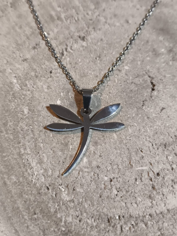 Colgante con forma de libélula realizado en acero, de acabado pulido que capta la luz con suavidad. El diseño muestra alas con finos detalles que transmiten movimiento y delicadeza; su peso ligero lo hace cómodo para llevar a diario sin renunciar a la resistencia del material.