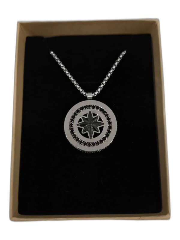 Colgante con la Rosa de los Vientos trabajado en acero inoxidable y acabado pulido, que realza los detalles del grabado. Se entrega con cadena de 55 cm incluida y cierre resistente; su diseño ligero permite un uso cómodo y cotidiano, manteniendo la durabilidad del material.