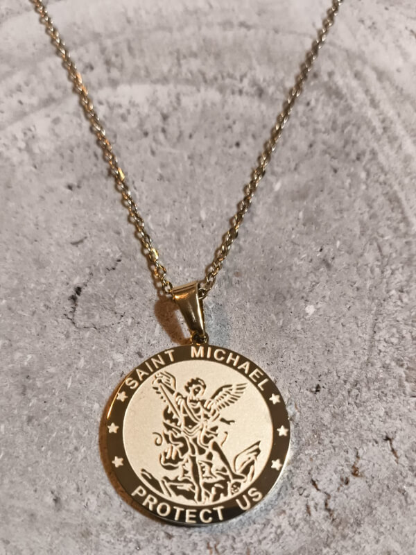Colgante de San Miguel Arcángel fabricado en acero con acabado dorado brillante. La pieza incluye cadena del mismo material; presenta un diseño ligero, resistente y con detalles definidos en el relieve del arcángel que aportan textura y presencia al colgante.