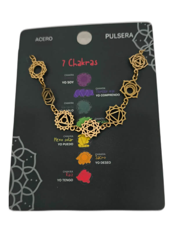 Pulsera con cuentas policromadas que representan los siete chakras, montadas sobre una base de acero con baño dorado. Las cuentas muestran tonos vibrantes y el acabado pulido le aporta un brillo elegante; su peso es ligero para un uso cotidiano y la estructura resistente mantiene la forma.