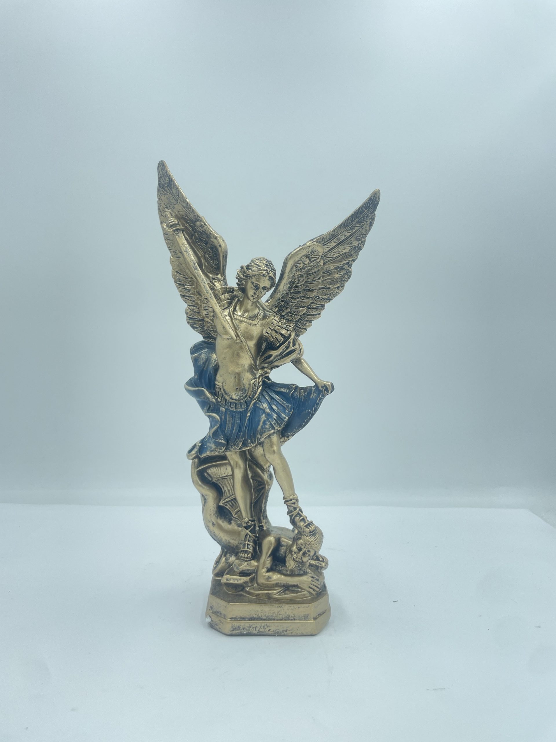 Figura detallada del Arcángel San Miguel, representado como guerrero celestial, protector y vencedor de las energías negativas. Realizada en tonos dorados y azules, transmite fuerza, poder y protección espiritual.
