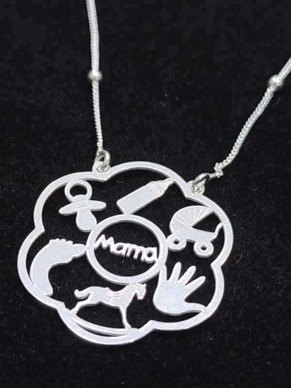 Colgante “Mamá” en plata de ley con cadena incluida. Presenta un diseño delicado y un acabado pulido que realza los detalles del motivo maternal, resultando ligero y cómodo para llevar a diario.