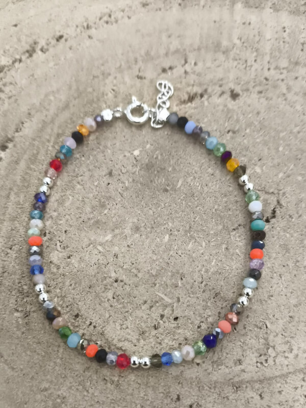 Pulsera realizada en plata con detalles multicolor que aportan un toque vibrante y elegante. Presenta un acabado pulido y una sensación ligera al llevarla, con pequeños elementos de color que captan la luz y animan cualquier conjunto.