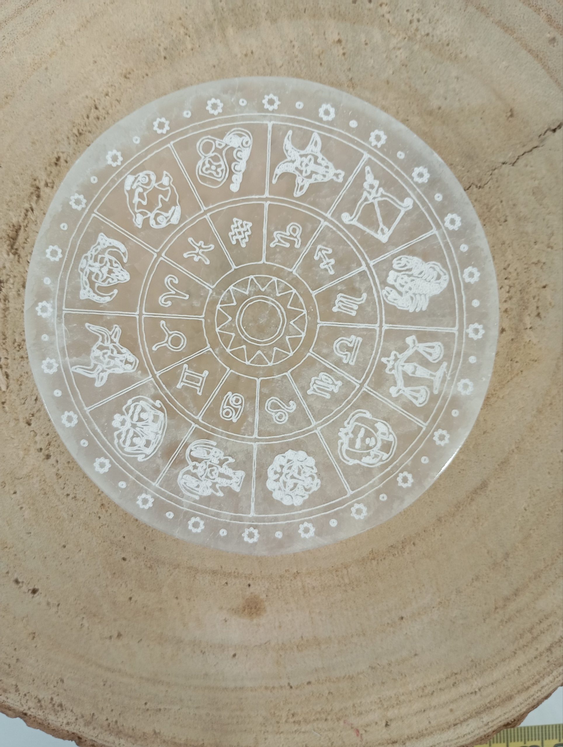 Base tallada en selenita natural, mineral de alta vibración que se utiliza para limpiar y recargar energéticamente otras piedras, joyas y amuletos.