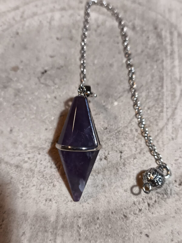 Péndulo de amatista formado por una gema semipreciosa pulida de tonalidad violeta, con transparencias y vetas naturales que hacen única a cada pieza. Va montado en una cadena metálica resistente y presenta un pulido suave al tacto, cómodo de sujetar durante la práctica de radiestesia o como objeto de contemplación.