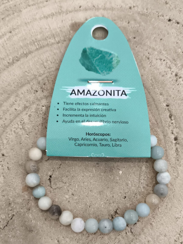 Pulsera confeccionada con cuentas naturales de amazonita que muestran una bella gama de verdes y azul verdosos, con vetas y ligeros matices que aportan carácter a cada pieza. El conjunto tiene un tacto suave y un acabado ligeramente pulido que realza los tonos de la piedra y permite un uso diario cómodo.