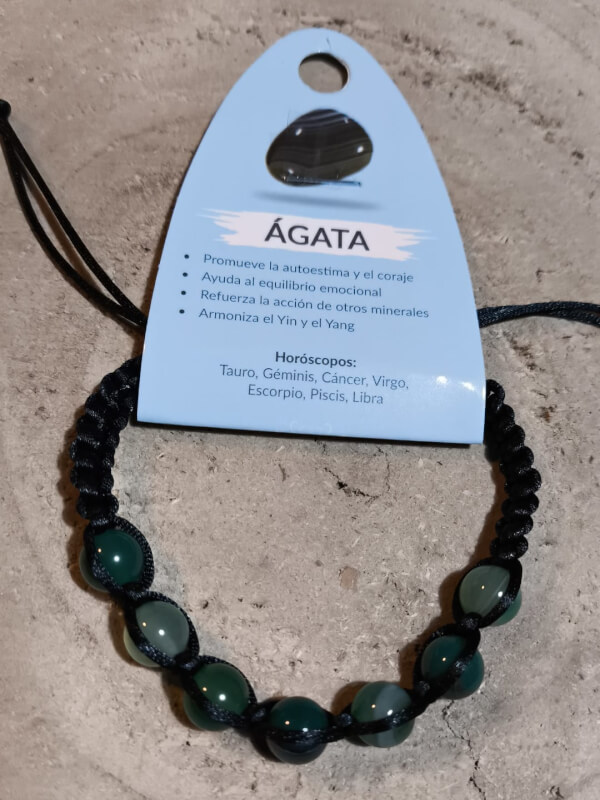 Pulsera confeccionada con cuentas de ágata verde montadas sobre cordón en macramé. Las piezas muestran variaciones naturales de tono y vetas que ofrecen un brillo y movimiento sutil; el cierre realizado con nudos permite cierto ajuste y evidencia un acabado artesano y resistente.