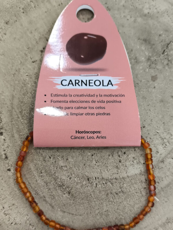 Pulsera formada por cuentas facetadas de carneola que reflejan la luz con un brillo cálido y tonos rojo-anaranjados profundos. Cada cuenta conserva la textura natural de la piedra, ofreciendo un aspecto elegante y ligeramente lustroso que se adapta a looks cotidianos y espirituales.