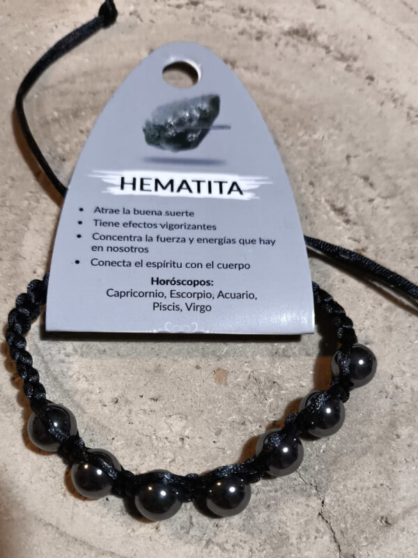 Pulsera confeccionada con cuentas pulidas de hematita, ensartadas sobre un cordón de macramé con nudo deslizante que permite ajustar la medida. Las cuentas presentan un brillo metalizado gris oscuro y una superficie lisa que aporta un tacto agradable y acabado artesanal.