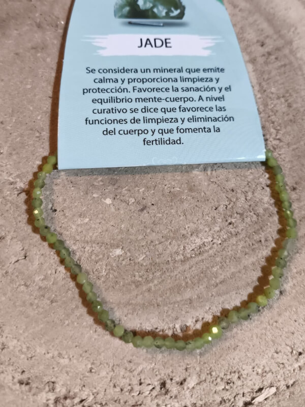 Pulsera compuesta por cuentas facetadas de jade de 2 mm que captan la luz con un brillo sutil. Las piezas muestran el tono verde característico del jade y están ensartadas en un hilo resistente para un acabado delicado y de gran ligereza.