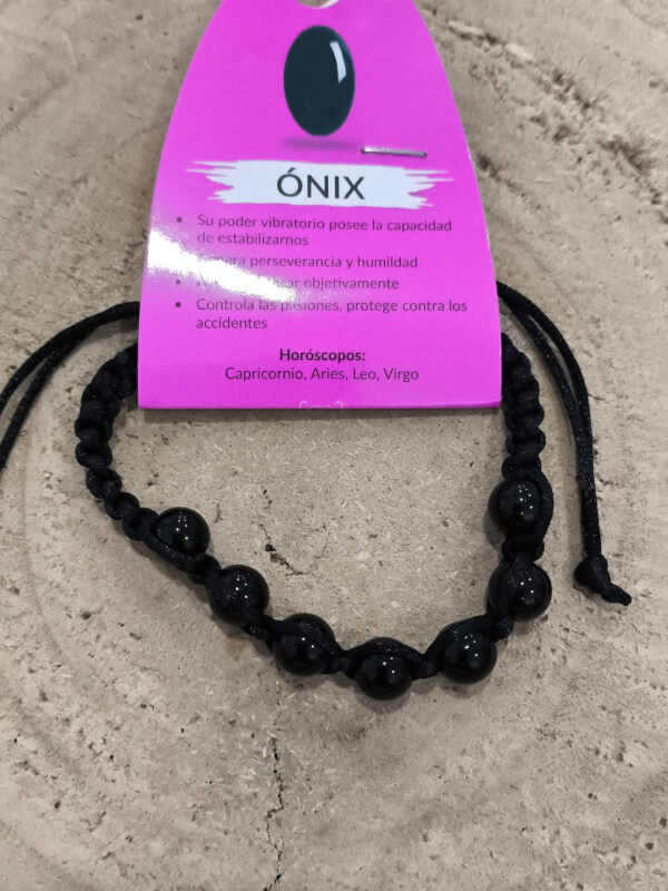 Pulsera de ónix en macramé formada por cuentas negras pulidas montadas sobre un cordón trenzado resistente con cierre ajustable. El contraste entre las cuentas oscuras y la trama del macramé aporta textura y una sensación artesanal, cómoda al llevar durante todo el día.