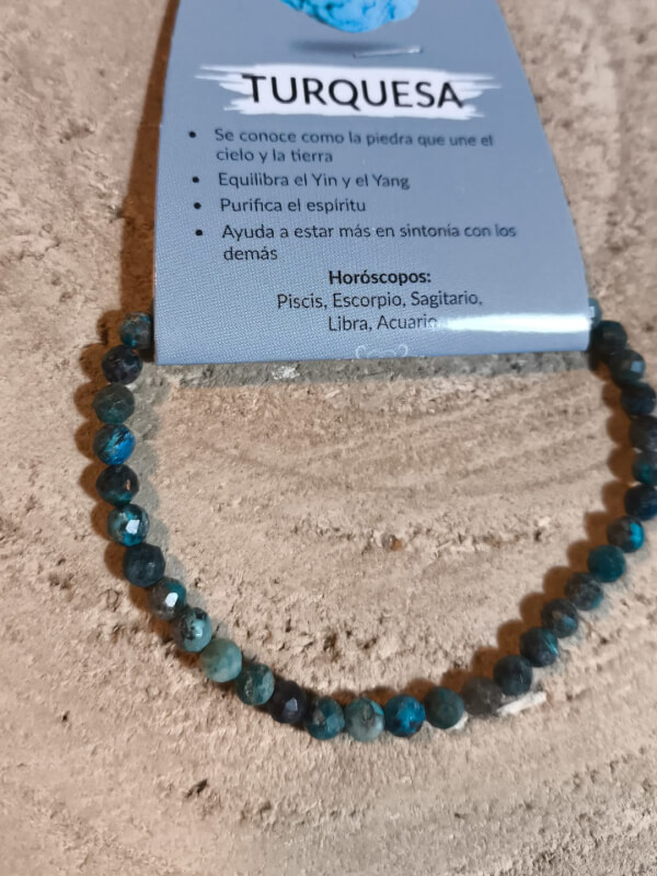 Pulsera compuesta por cuentas de turquesa facetada de 4 mm que reflejan la luz con un brillo sutil. Las cuentas muestran variaciones naturales en tonos azul verdoso y están montadas en hilo elástico resistente que facilita su colocación y ajuste, con un tacto ligero y cómodo en la muñeca.