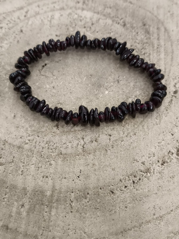 Pulsera compuesta por chips de granate de tono rojo oscuro y brillo natural, ensartados formando una pieza única de aspecto texturizado. Las pequeñas irregularidades y vetas de cada trocito de piedra aportan movimiento y calidez visual, mientras que el conjunto mantiene una estética artesanal y sencilla.