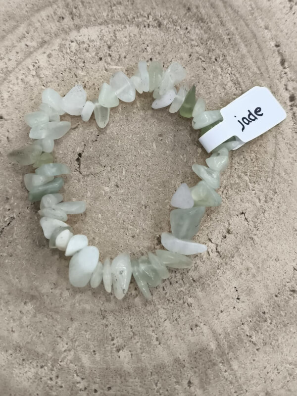Pulsera compuesta por pequeños chips de jade en tonos verdes naturales, montados sobre hilo elástico resistente. Las piezas presentan formas irregulares y un brillo suave que realza la textura de cada mineral, creando un aspecto artesanal y orgánico en la muñeca.