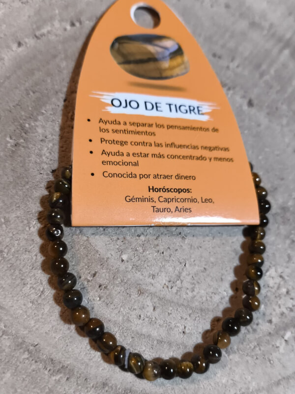 Lote de 3 pulseras fabricadas con cuentas redondas pulidas de ojo de tigre, diámetro aproximado de 4 mm. Las cuentas muestran los característicos tonos miel y dorado con destellos chatoyantes; cada pulsera está montada en hilo elástico resistente que permite un ajuste cómodo y discreto en la muñeca.