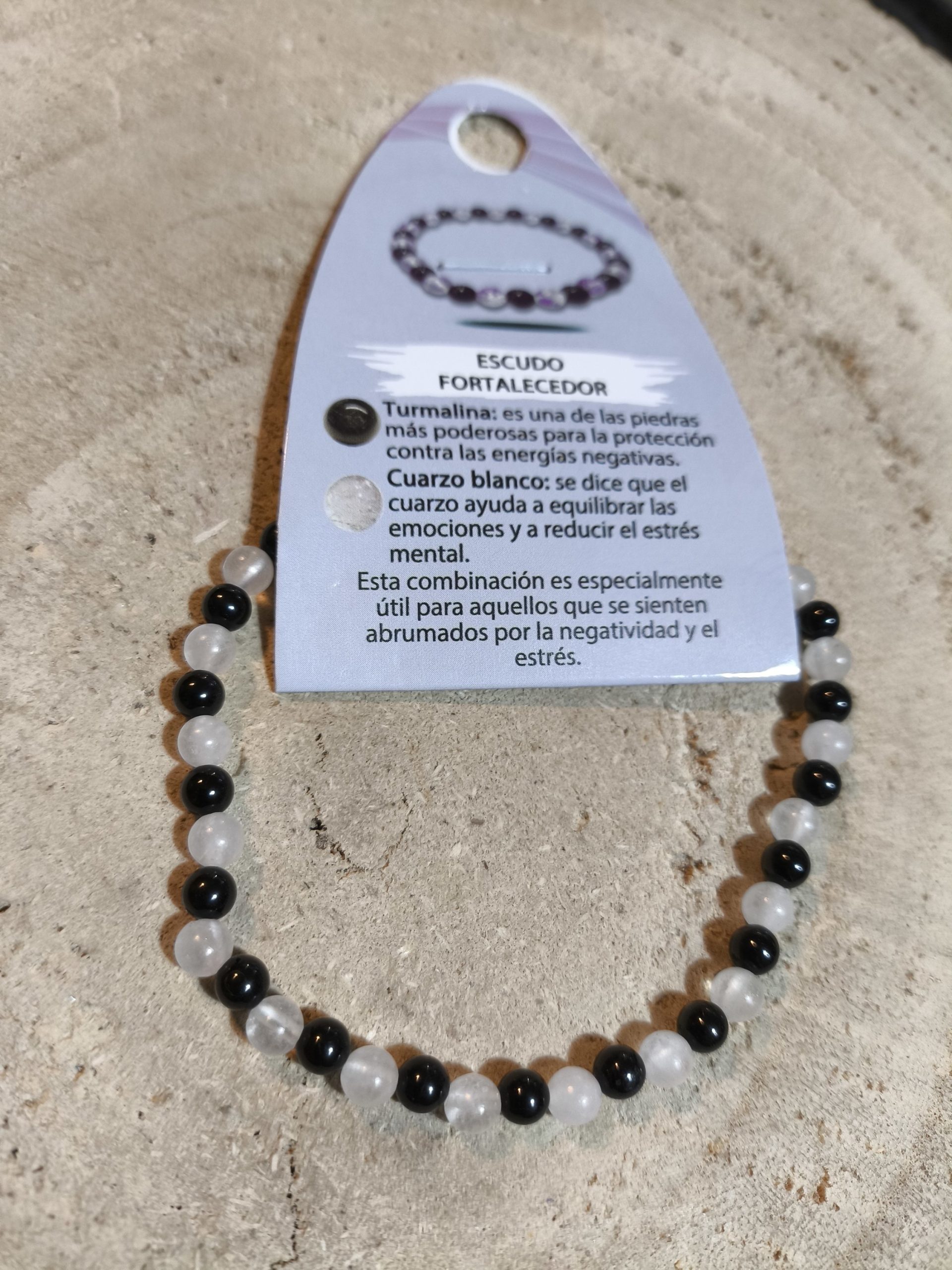 Pulsera escudo fortalecedor turmalina negra y cuarzo blanco en 4mm