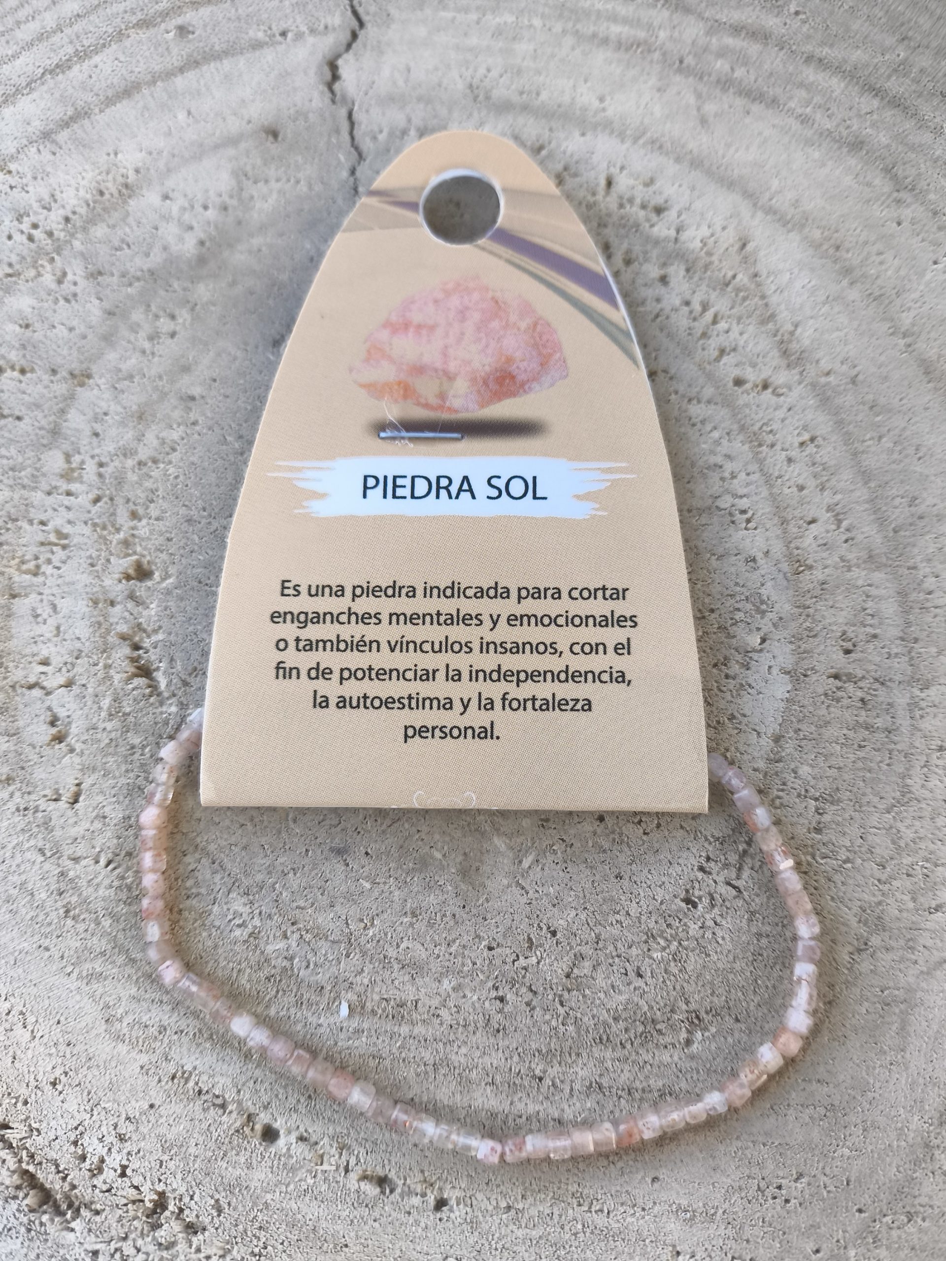 Pulsera elástica elaborada con finas cuentas de piedra sol natural facetada de 2×2 milímetros. Destaca por su brillo luminoso que simboliza el optimismo, la vitalidad y la energía positiva. Considerada una piedra de buena suerte, impulsa la confianza, la alegría y la motivación en el día a día.