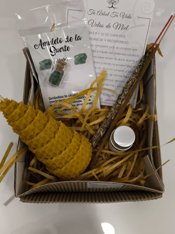 Conjunto de 5 elementos pensado para trabajar la apertura de caminos y atraer buena energía: vela de miel, agua de rosas, botella de jade, palo santo y ruda. Cada pieza aporta una textura y aroma distintos —cera cálida en la vela, notas florales en el agua de rosas, la presencia mineral del jade, la madera aromática del palo santo y la ruda seca— que se complementan en un set práctico listo para usar.