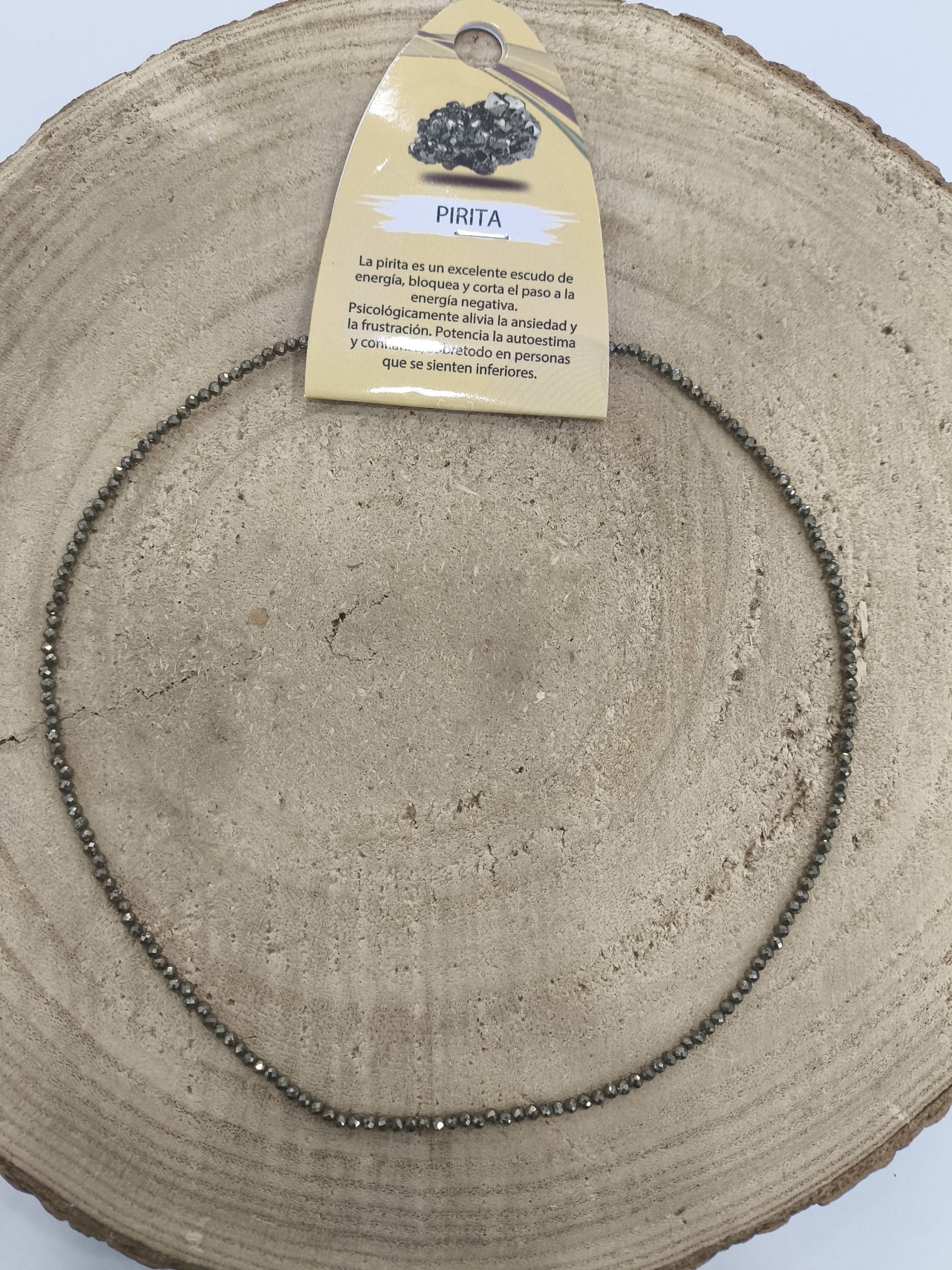 Gargantilla formada por cuentas facetadas de pirita que capturan la luz con un brillo metálico dorado-bronce. Las facetas realzan la textura natural del mineral y le confieren un aspecto luminoso y elegante, perfecto para acompañar tanto looks cotidianos como momentos de conexión interior.