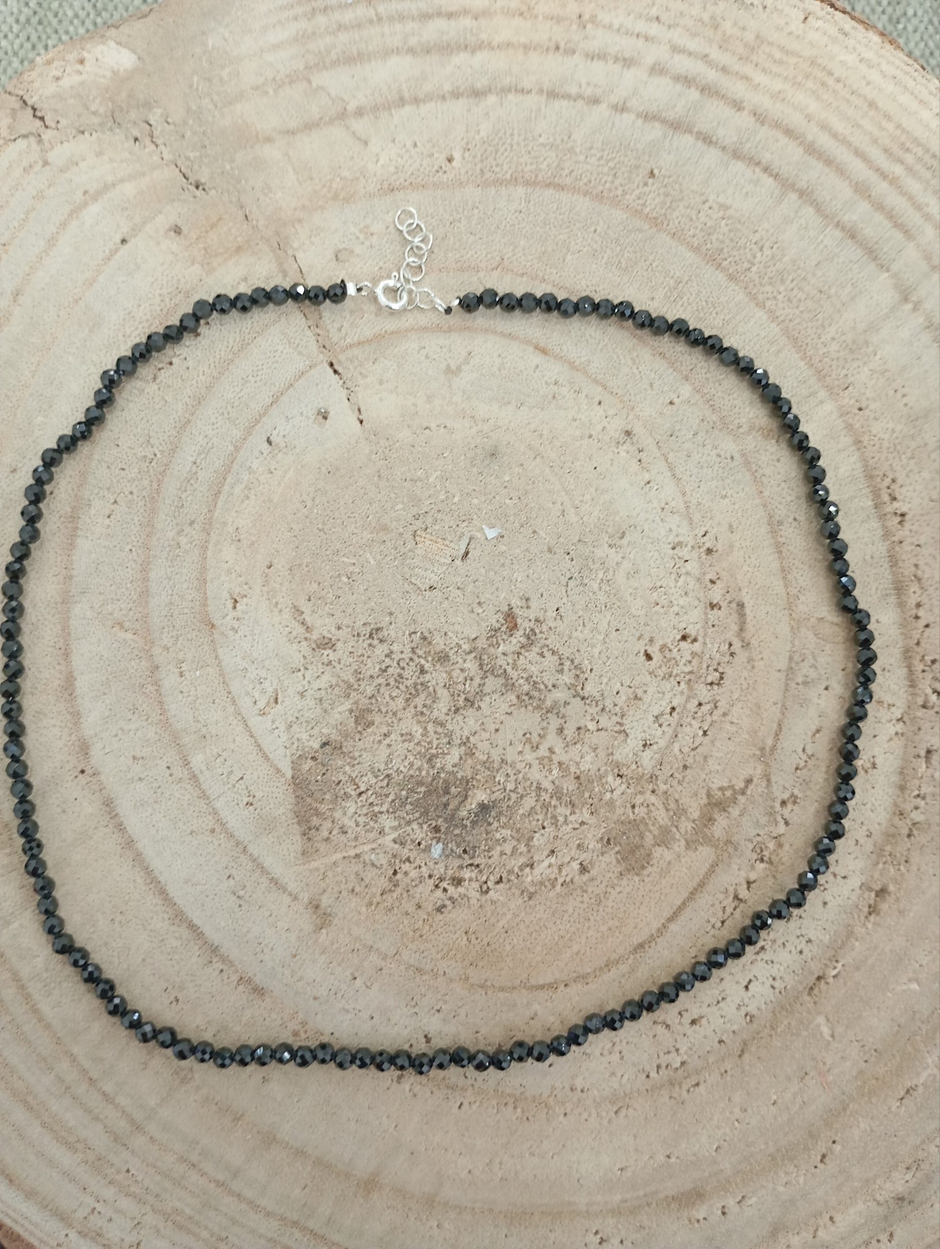 Gargantilla confeccionada con turmalina negra facetada de 3 mm: nueve cuentas pulidas que ofrecen un brillo sutil gracias a su corte facetado y un color negro profundo y uniforme. La superficie reflectante crea pequeños destellos que aportan elegancia discreta y una textura agradable al tacto.