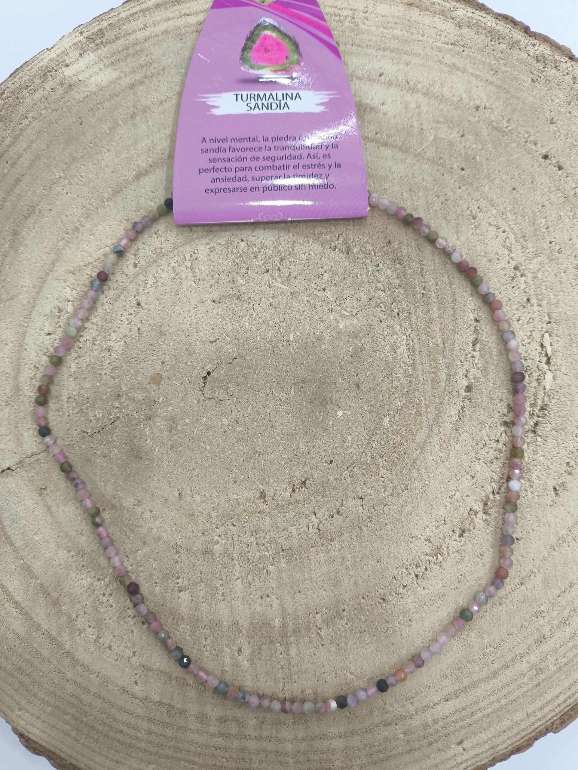 Gargantilla formada por cuentas facetadas de turmalina sandía que muestran tonos entre el rosa y el verde, con un brillo delicado que atrapa la luz en cada movimiento. Las cuentas presentan un acabado pulido y una caída ligera que aporta presencia sin resultar pesada, perfecta para combinar con otros collares o llevar sola.