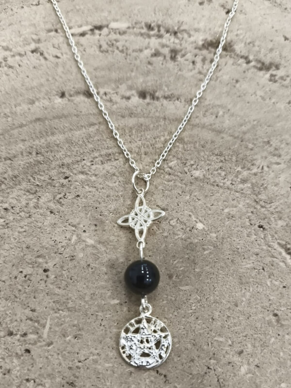 Colgante en plata de ley que integra un triple nudo de bruja, una pieza de turmalina negra pulida y el símbolo del Tetragramatón. Va montado en una cadena de 40 cm en plata de ley y presenta un acabado cuidado que realza el contraste entre la piedra oscura y la luminosidad de la plata.