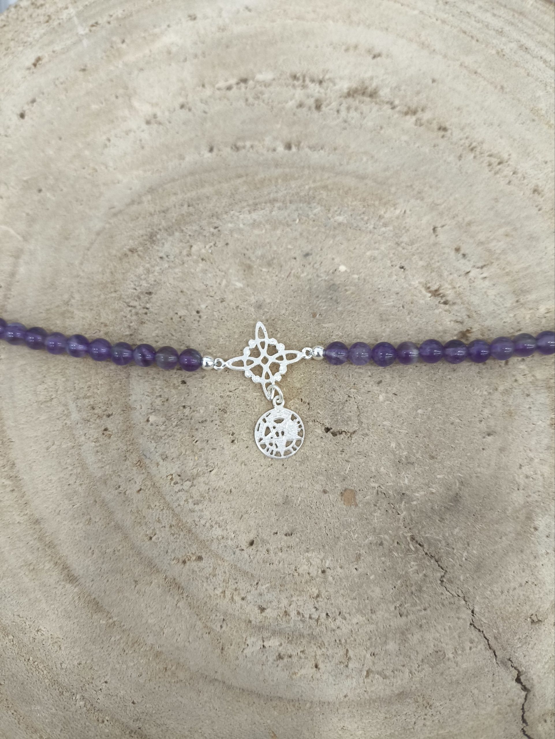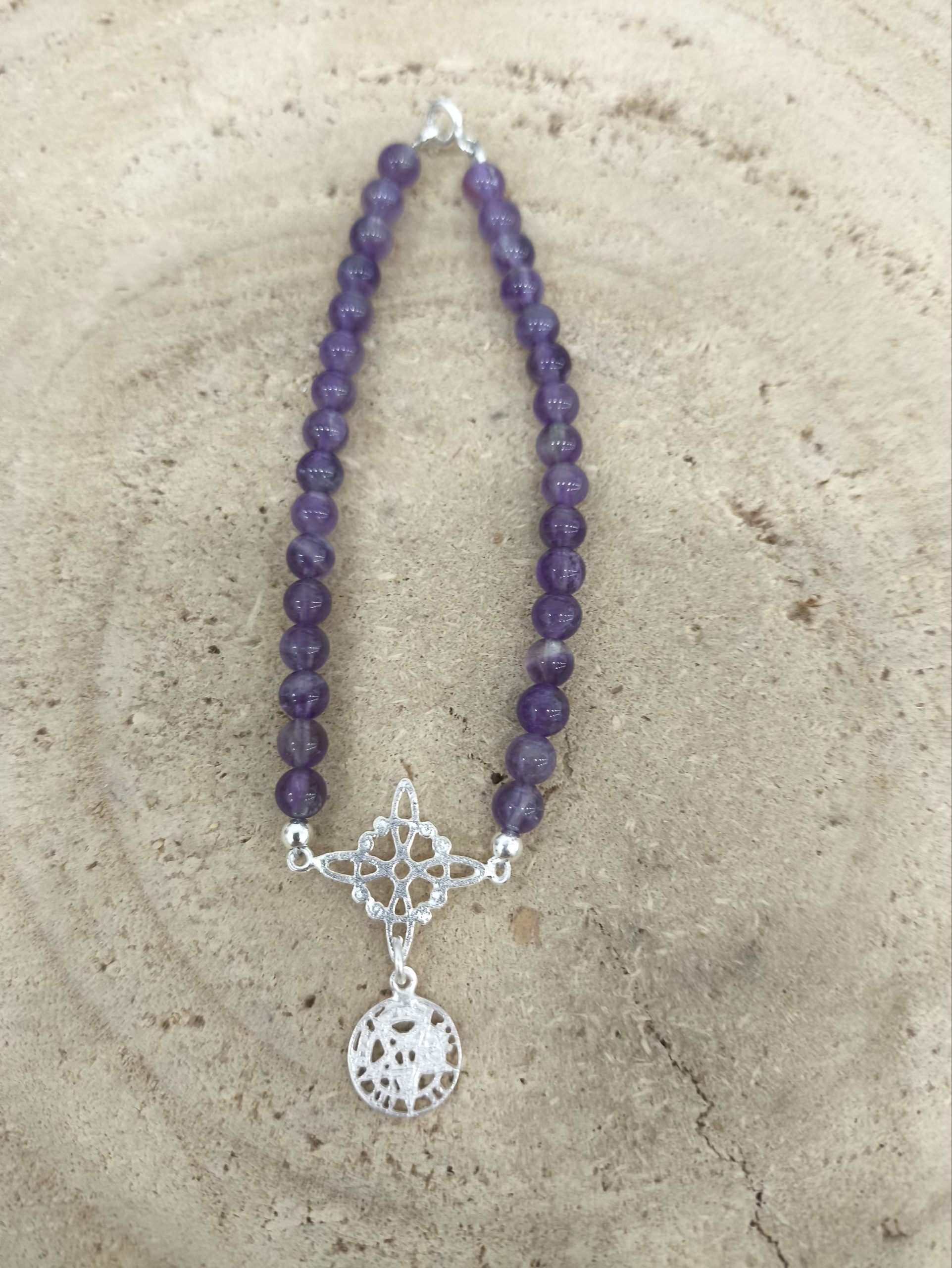 Pulsera confeccionada con cuentas pulidas de amatista de tono violeta intenso y remates en plata de ley que integran los amuletos del Nudo de Bruja y el Tetragramatón. El conjunto combina la textura sedosa de las piedras con el brillo sutil de la plata, ofreciendo una pieza con presencia y acabado cuidado.