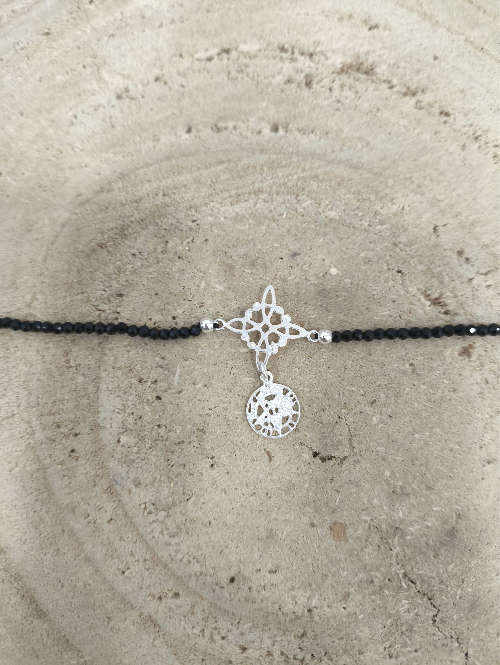 Pulsera compuesta por cuentas facetadas de turmalina negra que capturan la luz con un brillo sutil, acompañadas por motivos en plata de ley: el Nudo de Bruja y el medallón con el Tetragramatón. El contraste entre las piezas metálicas y las cuentas aporta textura y presencia, resultando en una pieza elegante y con carácter.