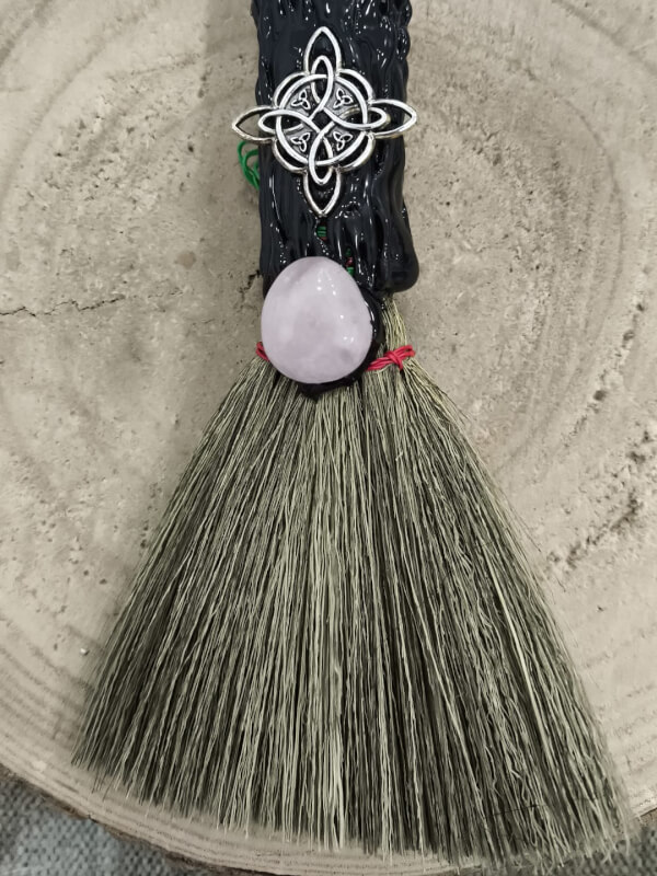 Escoba de bruja con Cuarzo Rosa y Nudo de bruja