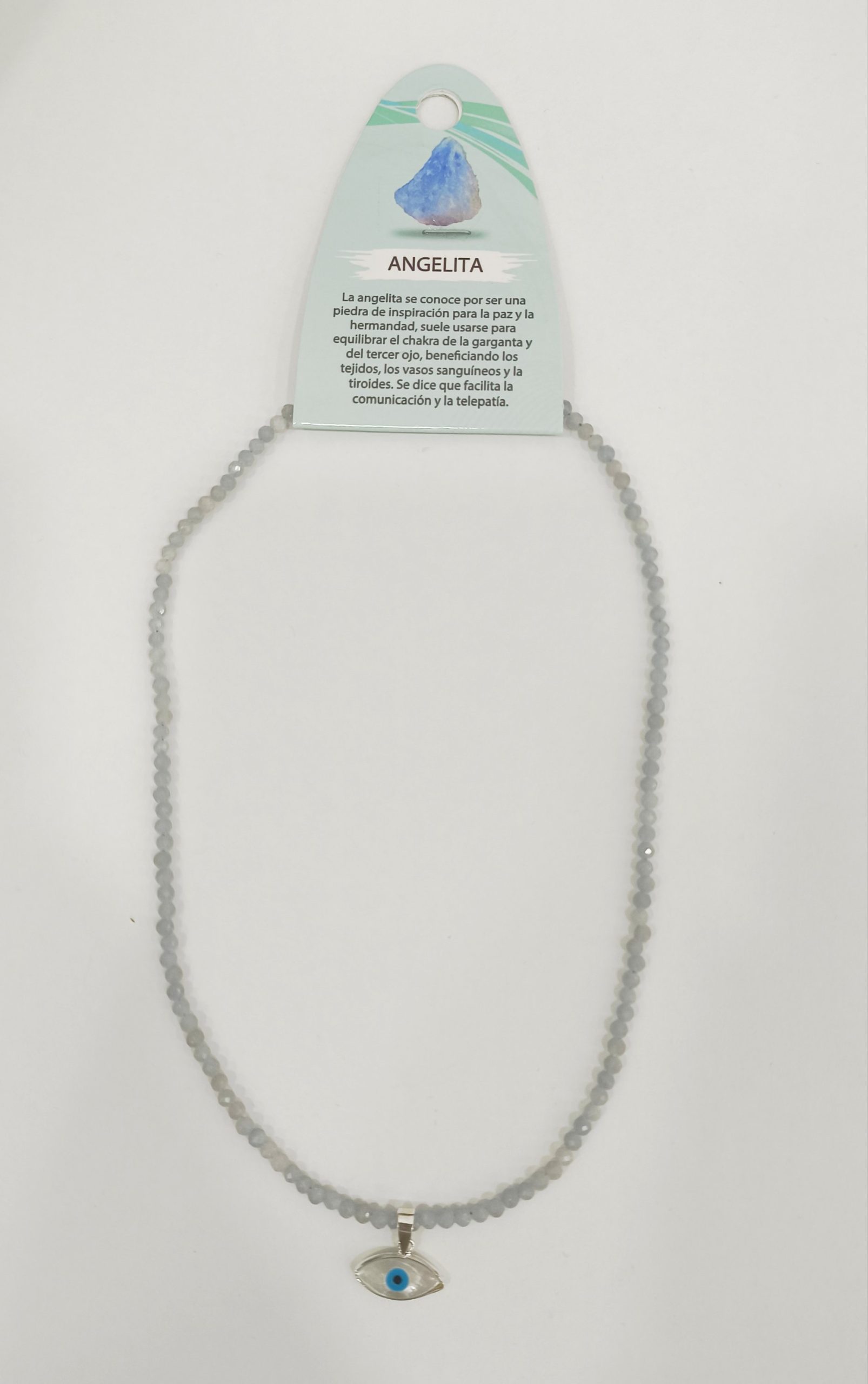 Gargantilla con colgante de nácar de brillo nacarado, coronado por un ojo turco en tonos azules y un pequeño motivo de angelita como detalle. La pieza presenta líneas delicadas y un acabado suave que aporta luminosidad cerca del rostro.
