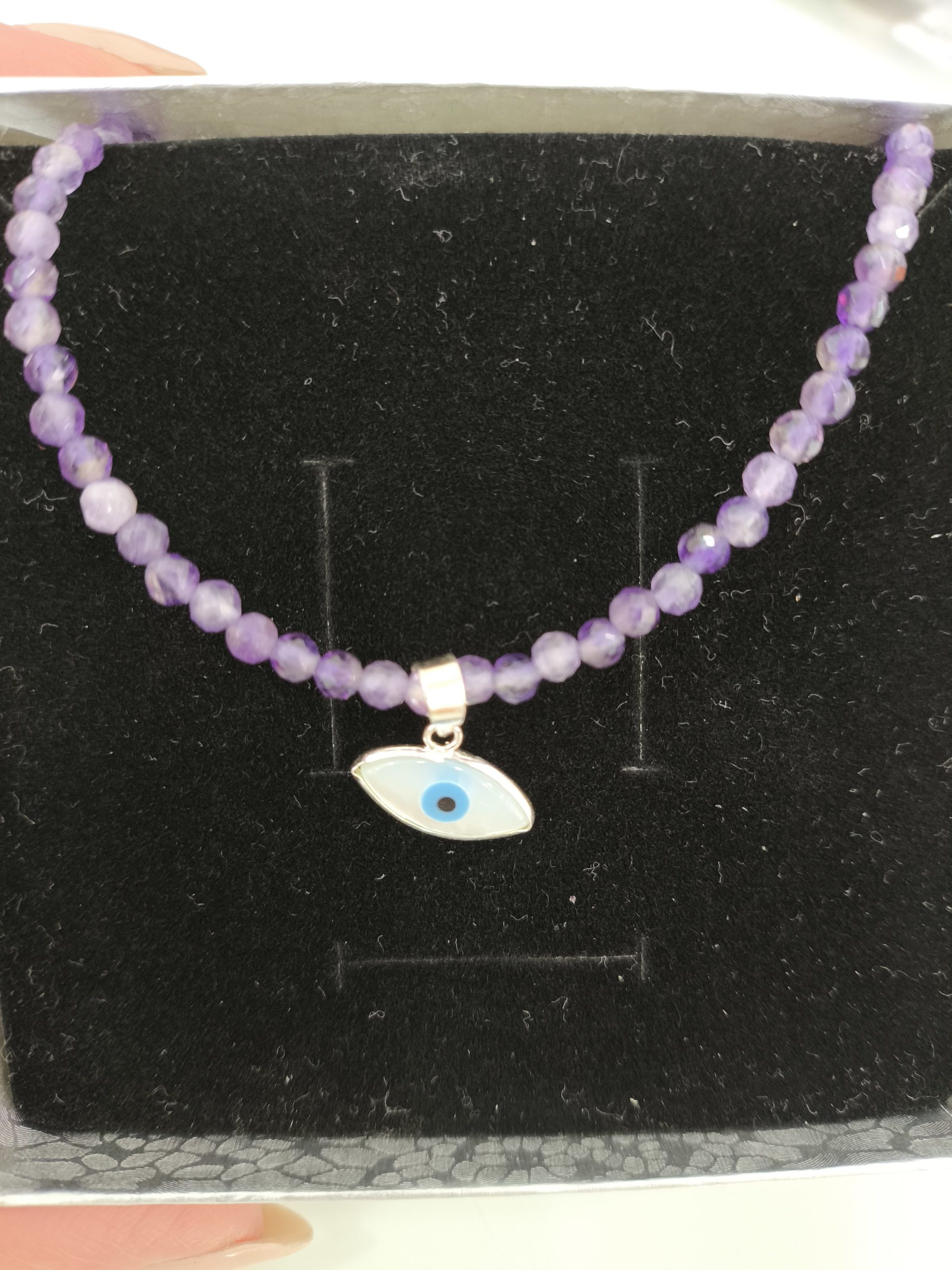 Gargantilla compuesta por cuentas de amatista facetada que reflejan la luz con un brillo sutil, combinada con un detalle central de ojo turco en nácar que aporta un acabado perlado y elegante. La pieza resulta ligera al llevar y mantiene una presencia delicada en el cuello gracias a su montaje cuidado y materiales naturales.