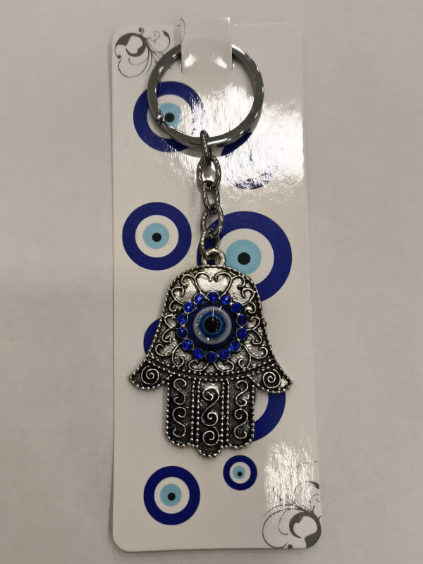 Llavero compacto con la representación de la mano de Fátima acompañado por un ojo turco. Presenta un acabado brillante y una anilla resistente que permite sujetarlo a llaves, bolsos o mochilas; su peso ligero y diseño ornamental lo convierten en un accesorio discreto pero llamativo.