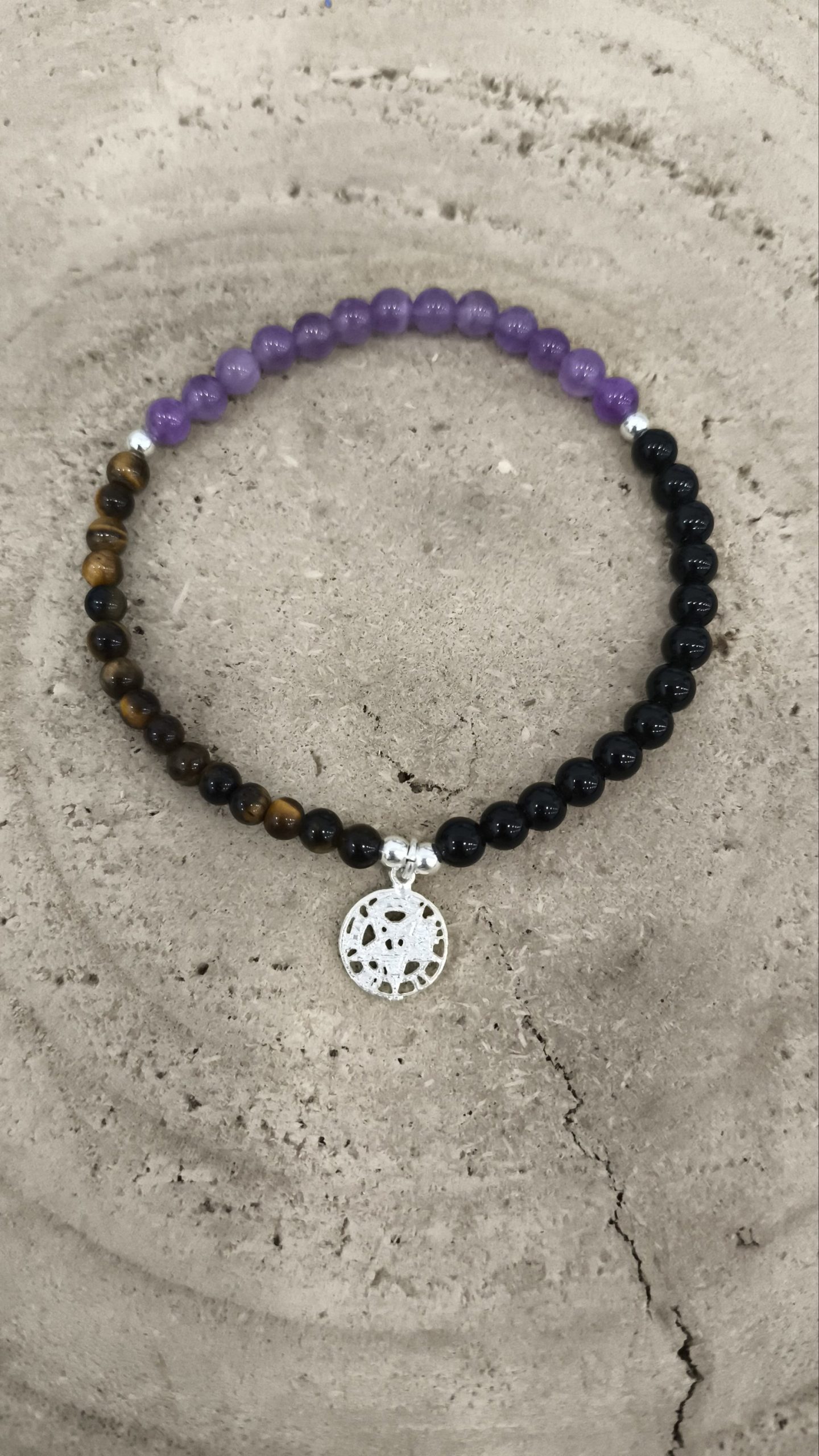 Pulsera compuesta por cuentas pulidas de turmalina (tono oscuro), amatista de matiz violeta y ojo de tigre con brillo miel, rematada con un colgante tetragramaton en plata. El juego de colores y texturas aporta presencia y elegancia en la muñeca, con un acabado cuidado que resalta la naturalidad de las piedras y el detalle metálico del amuleto.