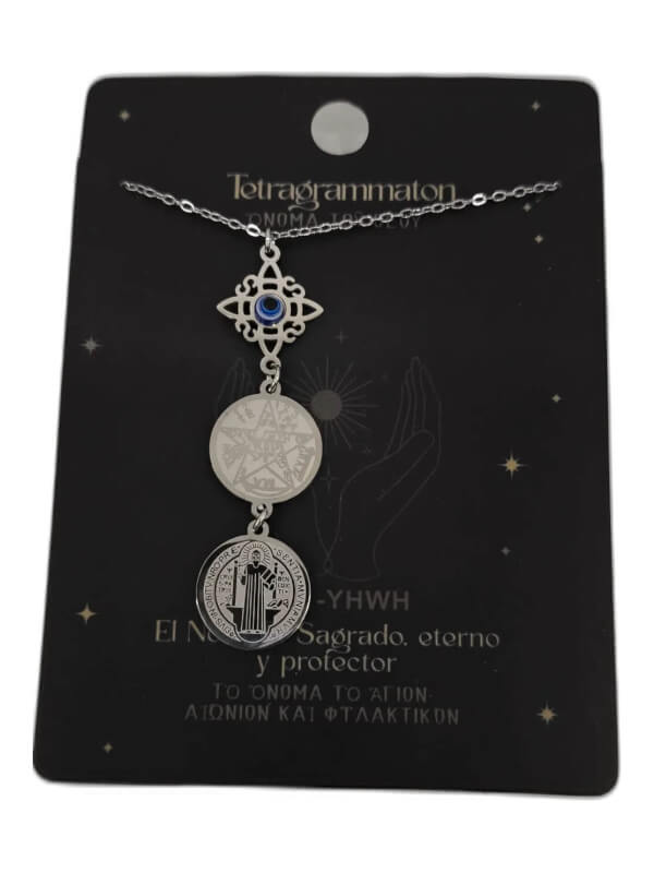 Colgante de triple protección, nudo de bruja con ojo turco, tetragramaton y San Benito, en acero