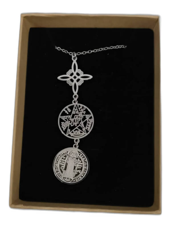 Colgante en acero con acabado pulido que incluye cadena del mismo material. Reúne tres símbolos: nudo de bruja, tetragramatón y medalla de San Benito, ensamblados en un diseño compacto y ligero que resiste el uso diario y la oxidación.