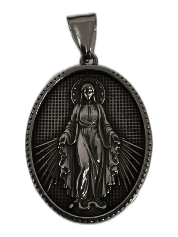Medalla de la Virgen Milagrosa en acero, con un diámetro aproximado de 3 cm; se acompaña de cadena de acero de 45 cm incluida. El diseño reproduce la figura tradicional de la Virgen con un acabado que mantiene su brillo y resistencia, pensado para un uso diario.